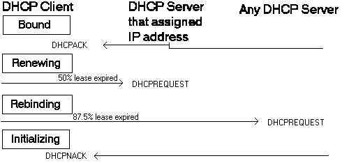 A DHCP client cannot use an IP address after the lease has expired. This is why a DHCP client mustrenew its lease on the IP address, preferably before the lease has expired or is about to expire. During the process of renewing its lease, a DHCP client goes through a number of different states as shown in Figure 6-2.