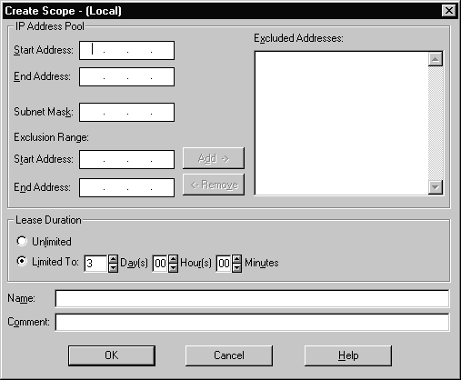 Specifies the time in seconds from address assignment until the clients lease on the address expires. The Create Scope or Scope Properties dialog box in DHCP Manager is used to specify lease time. It cannot be set directly from the DHCP Options menu. |