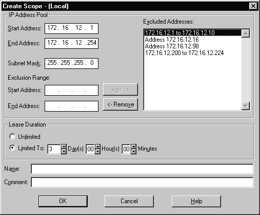 Also within the IP Address Pool is the Exclusion Range. The exclusion range should include all IP addresses that are assigned manually to other DHCP servers, diskless workstations, client systems that do not use DHCP, and Remote Access Service (RAS) clients. Once a range of IP addresses have been excluded, they will be displayed in the Excluded Addresses window in the right side of the Create Scope window as shown in Figure 6-6.