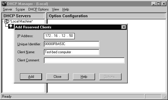 After a scope has been successfully created, it is possible to add reservations. A reservation is an IP address that is reserved for a specific DHCP client. The Add Reserved Clients windows has four dialog boxes to input data. The first dialog box is for the IP Address that will be reserved for a client. The second dialog box is used to input a Unique Identifier to identify the correct client that will receive the IP address. The data that goes in the Unique Identifier is the Media Access Control (MAC) address of the clients network interface card (NIC). The third and fourth dialog boxes are for the Client Name and Client Comment, respectively. The Client Name is used for identification purposes only and does not affect the real computer name of the client. Figure 6-7 shows a reservation for the IP address of 172.16.12.50. Exercise 3 shows you how to add a reservation for an IP address.