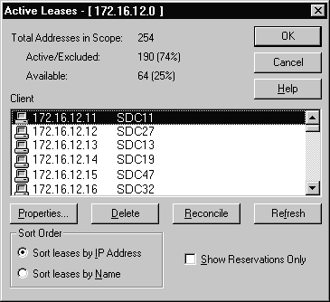 Viewing client reservations is very similar to the method used for viewing active leases. Using DHCP Manager, choose Active Leases from the Scope menu. Client Reservations are shown in the Client window along with all the active leases for the scope. You can scroll down the list or if you want to isolate only client reservations, you may choose the checkbox located to the left of Show Reservations Only. Figure 6-10 shows the client reservations for the 172.16.12.0 subnet by filtering out the active leases, using Show Reservations Only. The only reservation is the one you created in Exercise 6-3.