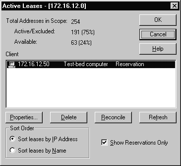 For purposes of the exercise, there was a reserved client already visible when you opened the Active Leases window. On a scope that is used in a production environment you may want to click the check box located to the left of Show Reservations Only so that only the clients with a reservation are displayed.