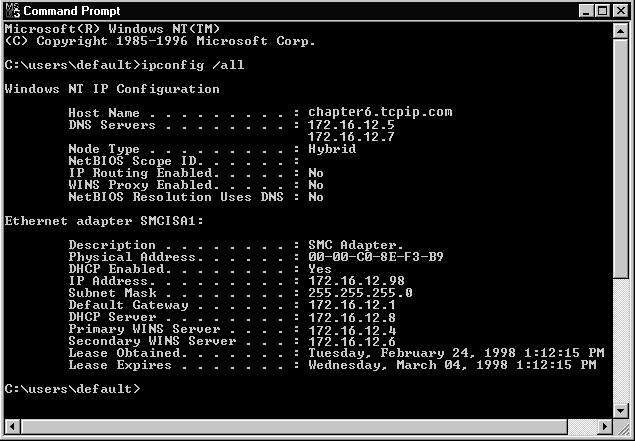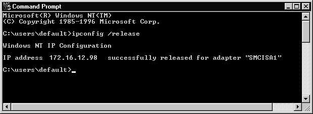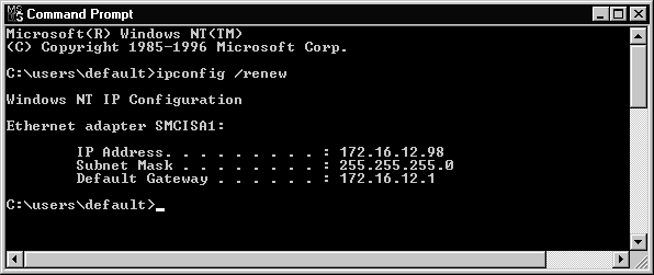 The first switch is IPCONFIG /renew. IPCONFIG /renew actually serves two purposes. It can renew an existing lease for an IP address and it can also obtain a new IP address if you have released the address using another switch. If your system has multiple NICs, then you need to specify which NIC to renew the address for by typing IPCONFIG /renew [adapter]. Replace [adapter] with the name of your NIC. Figure 6-13 shows a lease being renewed for a Windows NT DHCP client. Does the output on the screen look familiar? It should, because it is the same as what you see using an IPCONFIG with no switches, however your lease is renewed.