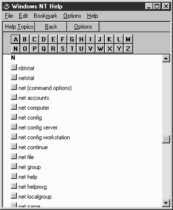 NetBIOS host names are used by all the net commands to carry information from one computer to another. . The commands use the Universal Naming Convention (UNC) syntax to specify which computer and resource to access. The syntax for UNC names is \\Servername\Sharename where Servername is the computer name of the server to connect to and Sharename is the name assigned to the shared resource on the server. . UNC names can also include directories and file paths in the following format: \\Servername\Sharename\Directoryname\Filename. . The Servername used is a NetBIOS host name to which the net commands append the appropriate hex character, in this case <20> to connect to the Server service. For a list of Net commands, enter NET HELP at a command prompt. . For further help on any command enter NET COMMAND HELP at a command prompt where COMMAND is the name of the command you want more information on. Figure 7-2 shows part of the indexed lst available on Windows NT commands. It can be found in Start® Help® Contents® Windows NT Commands® Windows NT Commands.