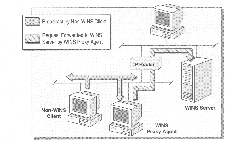 | Proxies do not register names. They just aid in the resolution process by listening for name resolution broadcasts from non-WINS Clients. These broadcasts will not cross a router, so placement of the Proxy is critical. | |