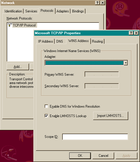 | Both the primary and secondary WINS Server addresses may be input through Network Properties, under the TCP/IP Protocol, Properties Button, WINS Address tab. | |
