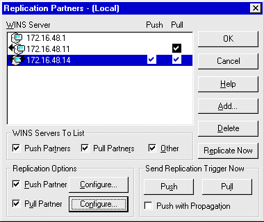 The replication process is configured in WINS Manager. Each WINS Server will be assigned one or more replication partners. These partners are defined as being either a push or pull partner. A pull partner is a WINS Server that pulls in replications of database entries from its partner by requesting and then accepting the replications. A push partner is a WINS Server that sends update notification messages to its partner when its WINS database has changed. This configuration ensures that the WINS database on each server contains the names and addresses for every network computer. In larger networks, with multiple WINS Servers, one WINS Server may be defined as the Central WINS Server, and all others will be its push or pull partners.