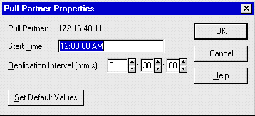 Pull partners are given a set time interval to request updates, if updates are not announced by push partners. In the example shown in Figure 8-12, the pull partner will request updates every 6-½ hours, beginning at midnight. This is done by requesting entries with a higher version ID than the last entry received from a partner during the last replication. Pull partners can and should be used between sites, especially across slow WAN links, because of the ability to designate a time for the update. The update should occur at times when the WAN is least used, usually at night, to conserve network resources.