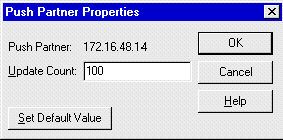 The Update Count box contains the minimum number of changes that must occur before the push partner notifies its pull partners to replicate. WINS Servers that handle large numbers of name registrations when users first log on should not be configured to replicate a small number of registrations.