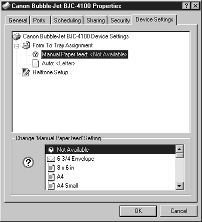 Figure 11: Device Setting Tab for BJC-4100. By default, the creator owner of a print job can manage his own print job. Figure 12-12 depicts what the screen looks like when you manage a print queue. Exercise 12-5 will teach you how to manage a print queue.